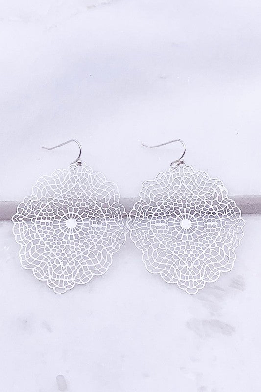 Brass Plated Filigree Earrings. Drop: 2". Available in Matte Silver and Matte Gold.