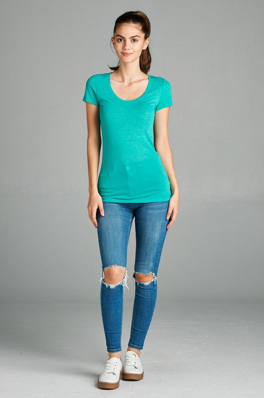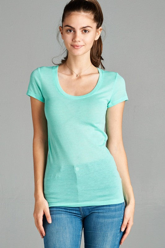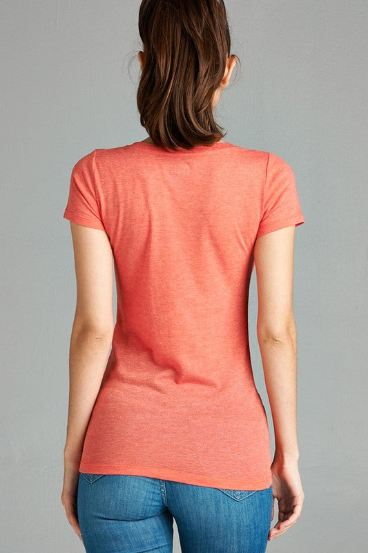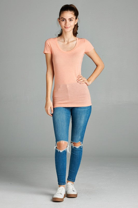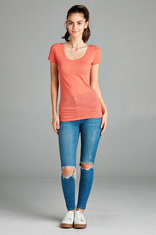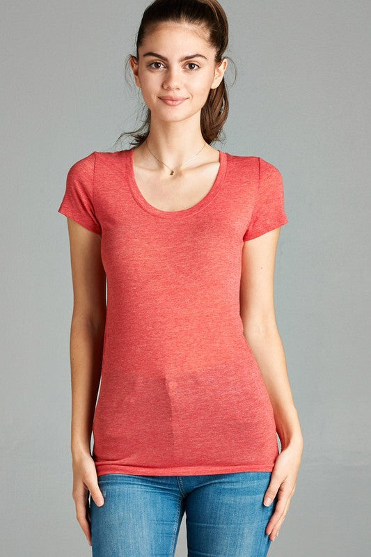 Short sleeve melange scoop neck tee. This tee is fitted and the contoured scoop neck frames the face. 60% Cotton, 40% polyester. Body Length: S-26 1/2", M- 27", L 27 1/2". Available in these colors: Aqua, Brownie, Coral, Jade Mint, Charcoal Grey, Sage, Peach Nectar, Red, Royal Blue, Nude.