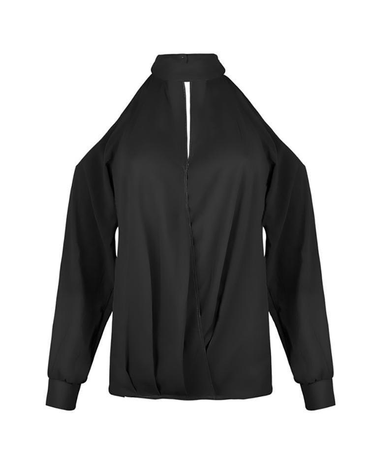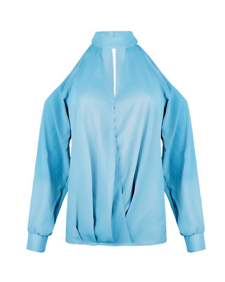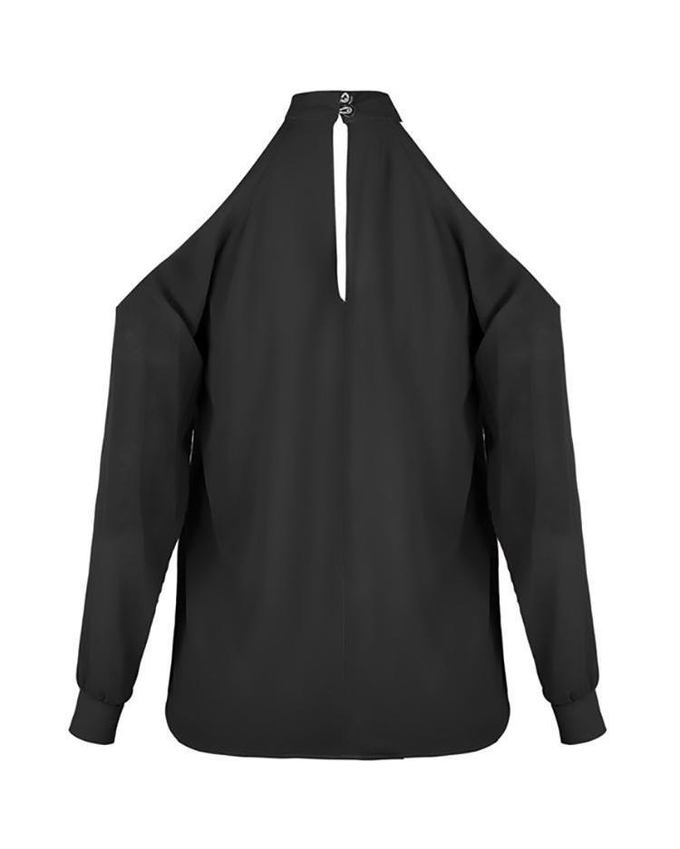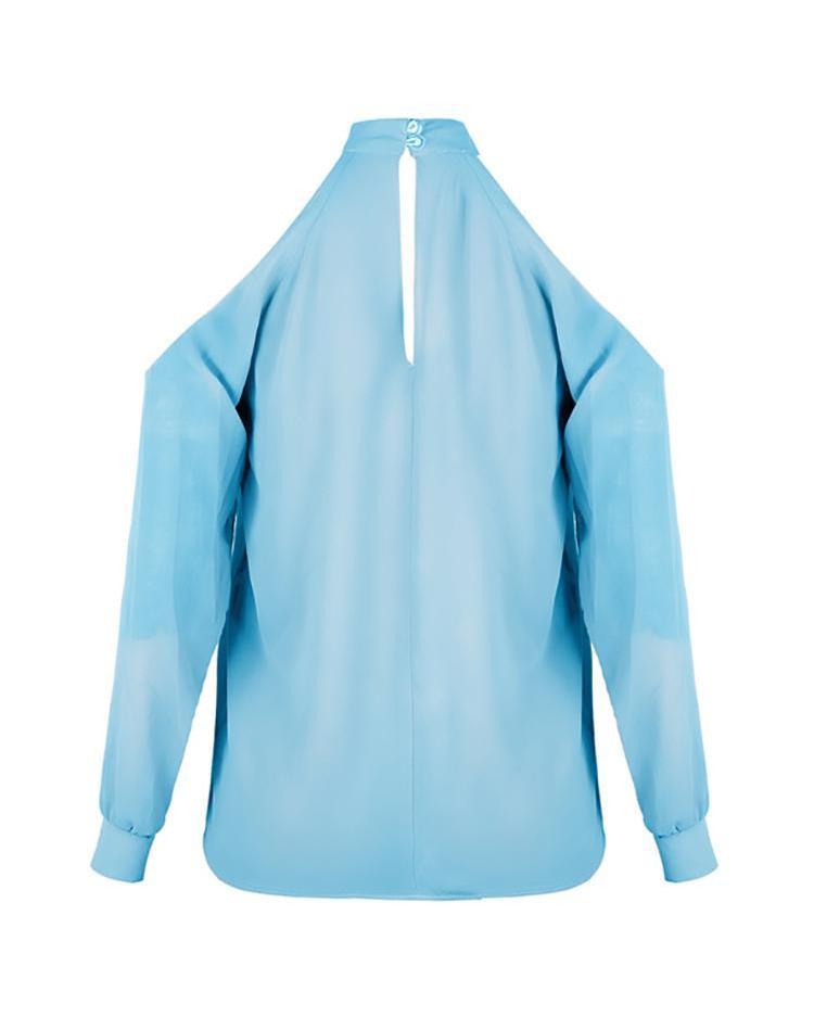 Cold shoulder cutout chiffon blouse, long sleeve, mock neck, solid color. 100% Polyester. Available in Light Blue and Black.